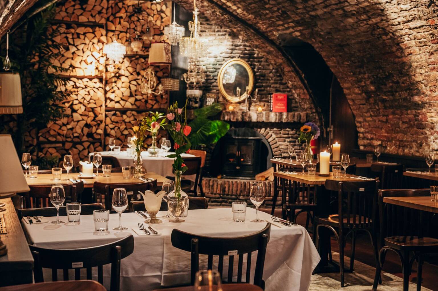 De warme, sfeervolle inrichting benut de charme van de werfkelders om een gezellige sfeer te creëren.
